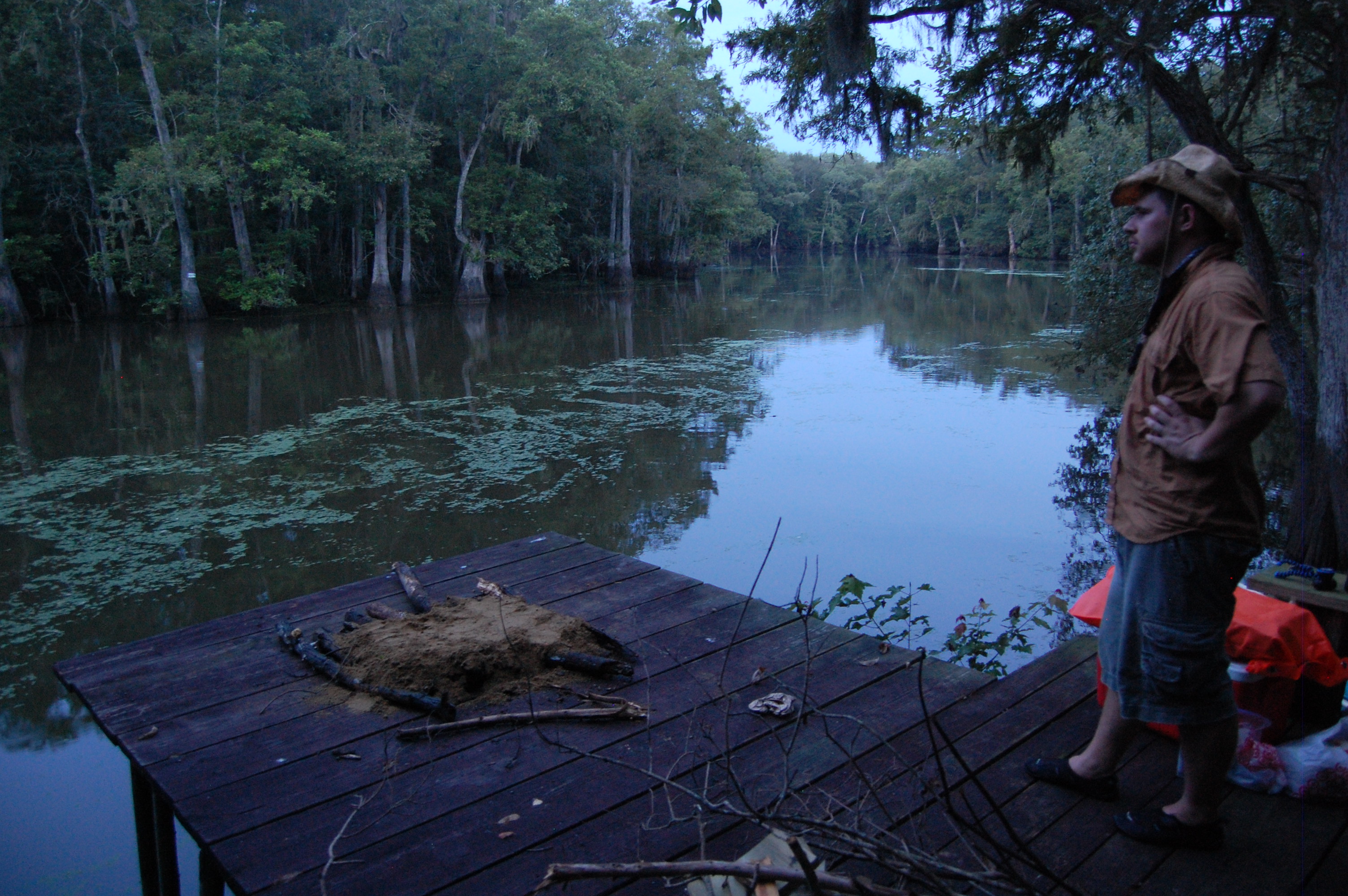 That night we camped on an old fishing dock constructed on a big bend in the bayou. Wesley and I built a fire near a “no trespassing” sign, drank more cheap bourbon and jumped in the canoe for a final excursion at dusk. Using a flashlight, we scanned the swamp for gator eyes. This activity entertained us until we saw how far we had strayed from our dock. Looking back, tiny flames flickered against the wooded backdrop and reflected off the water. The sky above us had faded from a light blue to black and a different set of noises filled the cooling air. Night had fallen on Lacassine Bayou and made us realize just how alone we were. As the feeling sank in, we decided we had had enough alligator encounters for the day. So, Wes and I rowed back through the dark waters to our swamp home.