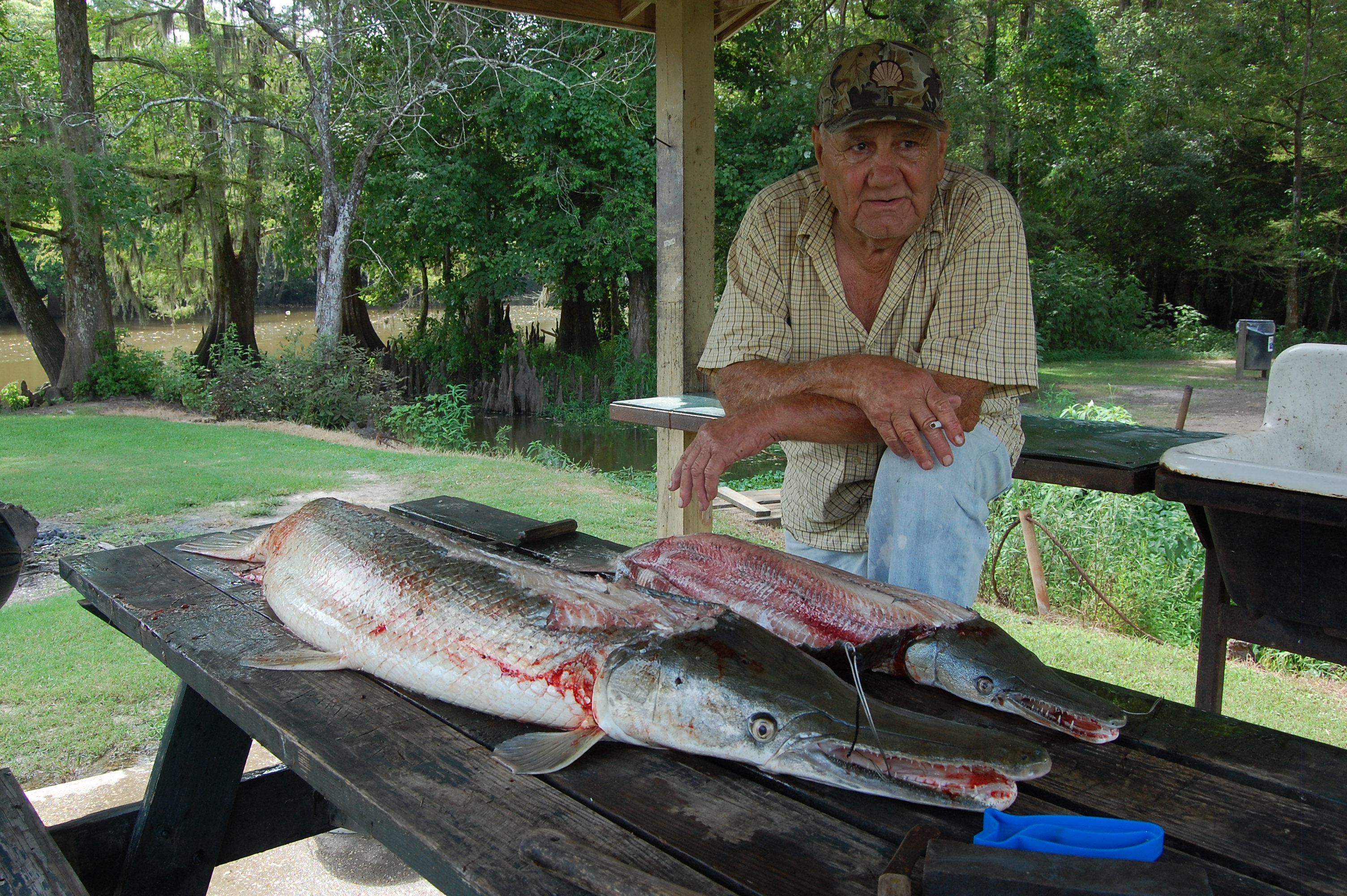 A local with his catch of Alligator Gars. This man and his friend cleaned them with a rusty hatchet and told us they were making 'gar-balls.'