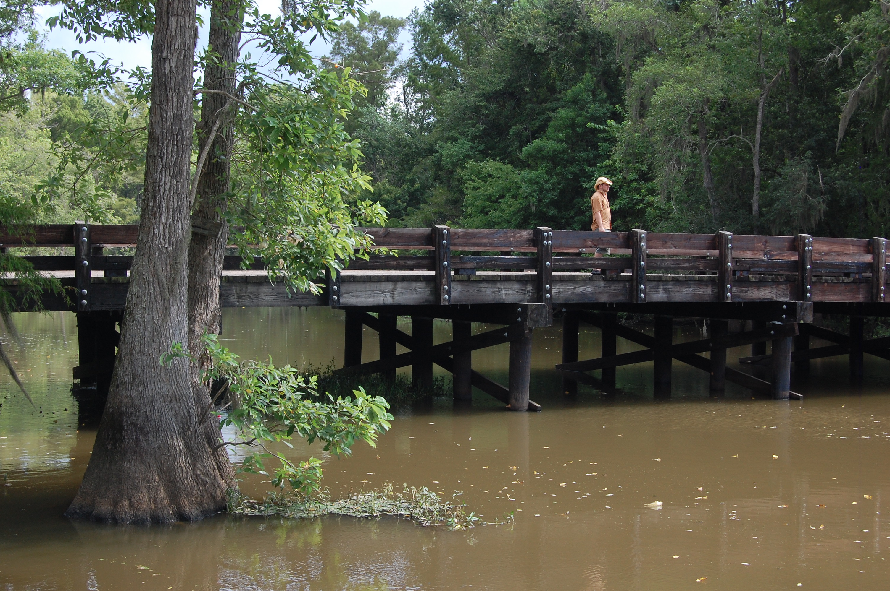 For the moment, we drove out of the storm and followed the directions to a place called Lorrain Bridge*, where stout pillars supported the low wooden structure across the mid-sized Lacassine Bayou. Bald Cypress trees draped in Spanish moss lined its edges. There, the lazy brown water of the bayou met the cypresses at their knees and seeped into the surrounding dim swamps filled with duckweed, gators, and God knows what else. This was the quintessential piece of Louisiana we were looking for.
